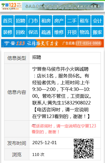 宁晋叁马侯市井小火锅诚聘:店长1名,服务员6名。有经验者优先,上班时间:上午9:30—2:00,下午4:30—10:00。管吃不管住,工资面议。联系人:黄先生15832908022 【电话咨询时,请一定说明在宁晋123看到的,谢谢!】 |