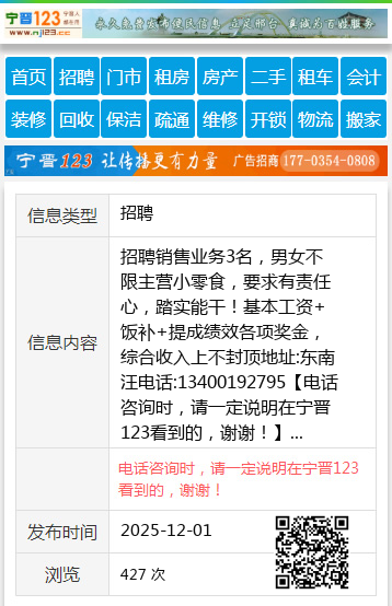 招聘销售业务3名,男女不限主营小零食,要求有责任心,踏实能干!基本工资+饭补+提成绩效各项奖金,综合收入上不封顶地址:东南汪电话:13400192795 【电话咨询时,请一定说明在宁晋123看到的,谢谢!】 |