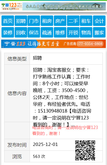 招聘:淘宝客服女;要求:打字熟练工作认真;工作时间:8个小时;可以接受早晚班,工资:3500-4500,公休2天,工作地点:世纪华府,有经验者优先。电话:15130948018 【电话咨询时,请一定说明在宁晋123看到的,谢谢!】 |