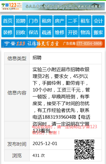 实验三小附近超市招聘收银理货2名,要求女,45岁以下,手脚伶俐,勤劳肯干,10个小时,工资三千元,管一顿饭,早晚两班倒,有季度奖,接受不了时间的勿扰,有工作经验者优先,联系电话18831939604微 【电话咨询时,请一定说明在宁晋123看到的,谢谢!】 |