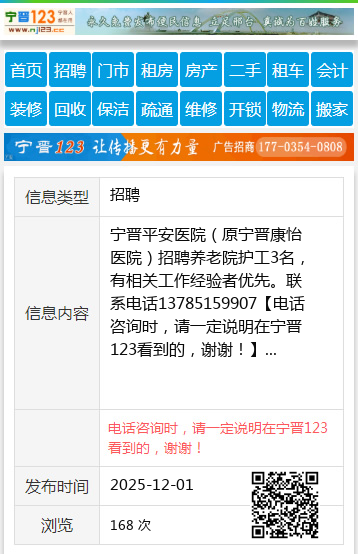 宁晋平安医院(原宁晋康怡医院)招聘养老院护工3名,有相关工作经验者优先。联系电话13785159907