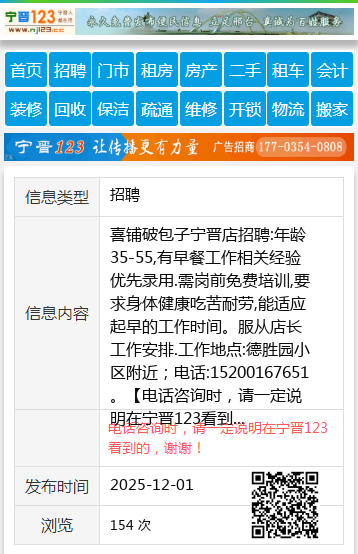 喜铺破包子宁晋店招聘:年龄35-55,有早餐工作相关经验优先录用.需岗前免费培训,要求身体健康吃苦耐劳,能适应起早的工作时间。服从店长工作安排.工作地点:德胜园小区附近;电话:15200167651。 【电话咨询时,请一定说明在宁晋123看到的,谢谢!】 |