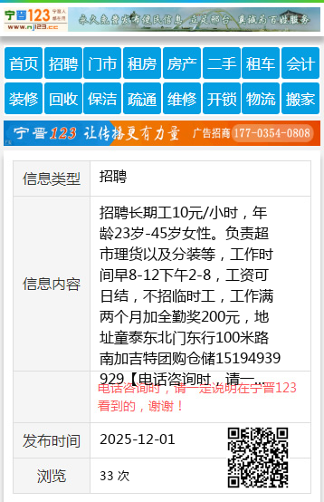 招聘长期工10元/小时,年龄23岁-45岁女性。负责超市理货以及分装等,工作时间早8-12下午2-8,工资可日结,不招临时工,工作满两个月加全勤奖200元,地址童泰东北门东行100米路南加吉特团购仓储15194939929 【电话咨询时,请一定说明在宁晋123看到的,谢谢!】 |