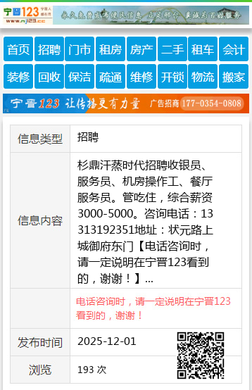 杉鼎汗蒸时代招聘收银员、服务员、机房操作工、餐厅服务员。管吃住,综合薪资3000-5000。咨询电话:13313192351地址:状元路上城御府东门 【电话咨询时,请一定说明在宁晋123看到的,谢谢!】 |