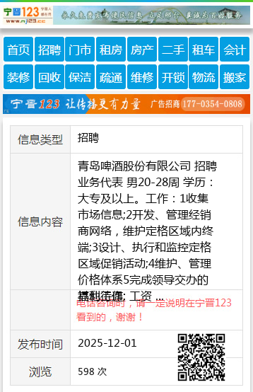 青岛啤酒股份有限公司 招聘业务代表 男20-28周 学历:大专及以上。工作:1收集市场信息;2开发、管理经销商网络,维护定格区域内终端;3设计、执行和监控定格区域促销活动;4维护、管理价格体系5完成领导交办的其他工作;