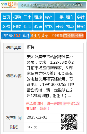 美团外卖宁晋站招聘外卖业务员,要求:1.22-38周岁2.开拓市场签约新商家。3.商家运营维护及推广4.会基本的电脑使用和表格使用。联系电话:19913000755 【电话咨询时,请一定说明在宁晋123看到的,谢谢!】 |