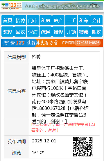铝导体工厂招熟练拔丝工、绞丝工(400框绞、管绞)。地址:贾家口镇黄儿营宁联电缆西行100米十字路口南环宾馆(现改名盛宁宾馆)南行400米路西即到联系电话18630167028 【电话咨询时,请一定说明在宁晋123看到的,谢谢!】 |