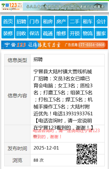 宁晋县大陆村镇大贾线机械厂招聘:文员3名女已婚已育会电脑;女工3名;质检3名;打磨工5名;组装工5名;打包工5名;焊工5名;机械手操作工5名;大陆村附近优先!电话13931933761 【电话咨询时,请一定说明在宁晋123看到的,谢谢!】 |
