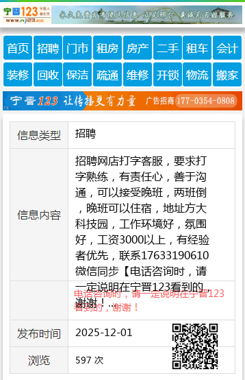 招聘网店打字客服,要求打字熟练,有责任心,善于沟通,可以接受晚班,两班倒,晚班可以住宿,地址方大科技园,工作环境好,氛围好,工资3000以上,有经验者优先,联系17633190610微信同步 【电话咨询时,请一定说明在宁晋123看到的,谢谢!】 |