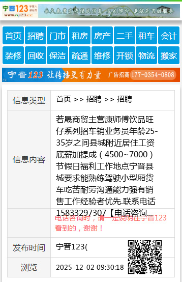 若晟商贸主营康师傅饮品旺仔系列招车销业务员年龄25-35岁之间县城附近居住工资底薪加提成(4500~7000)节假日福利工作地点宁晋县城要求能熟练驾驶小型厢货车吃苦耐劳沟通能力强有销售工作经验者优先.联系电话15833297307 【电话咨询时,请一定说明在宁晋123看到的,谢谢!】 |