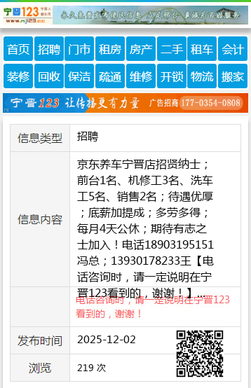 京东养车宁晋店招贤纳士;前台1名、机修工3名、洗车工5名、销售2名;待遇优厚;底薪加提成;多劳多得;每月4天公休;期待有志之士加入!电话18903195151冯总;13930178233王 【电话咨询时,请一定说明在宁晋123看到的,谢谢!】 |