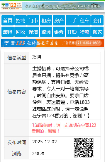 主播招募,可选择来公司或居家直播,提供有竞争力高额保底,支持日结。无经验要求,专人一对一培训指导,时间自由安排。要求口齿伶俐,表达清楚,电话18032961177