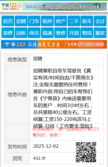 招聘兼职自带车驾驶员《真实有效/时间自由/不限男女》注:全程无需缴纳任何费用!兼职内容:用自己的车帮我们在《宁晋县》内接送需要用车的客户,时间3小时左右,总共里程40公里左右。工资结算:工资150-220完活马上结算-日结!工作要求:驾龄3年以上,车龄8年以内,限邢台市车牌私家车:轿车,越野车,商务车均可。注:冀E冀A车牌能做的加微信:DD522039或致电:15716993650 【电话咨询时,请一定说明在宁晋123看到的,谢谢!】 |