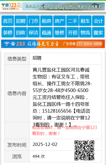 黄儿营盐化工园区河北春诚生物招:有证叉车工,带班组长、操作工男女不限男28-55岁女28-48岁4500-6500元工资月结管吃住入保险,盐化工园区纬一路十四号张总:15128165656 【电话咨询时,请一定说明在宁晋123看到的,谢谢!】 |