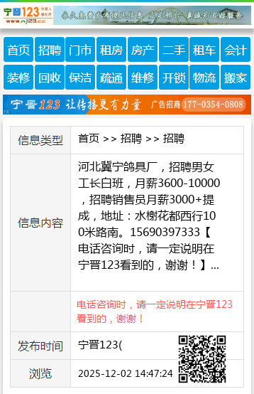 河北冀宁鸽具厂,招聘男女工长白班,月薪3600-10000,招聘销售员月薪3000+提成,地址:水榭花都西行100米路南。15690397333 【电话咨询时,请一定说明在宁晋123看到的,谢谢!】 |