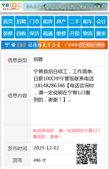 宁晋县招日结工,工作简单日薪100➕中午管饭联系电话:18148286346