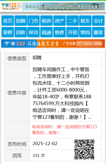 招聘车间操作工,中午管饭,工作简单好上手,开机打包流水线,十二小时两班倒,计件工资6000-8000元,年龄18-40岁,有意联系18875764599.方大科技园内 【电话咨询时,请一定说明在宁晋123看到的,谢谢!】 |