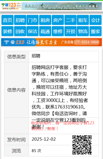招聘网店打字客服,要求打字熟练,有责任心,善于沟通,可以接受晚班,两班倒,晚班可以住宿,地址方大科技园,工作环境好氛围好,工资3000以上,有经验者优先,联系17633190610。微信同步 【电话咨询时,请一定说明在宁晋123看到的,谢谢!】 |