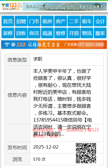 本人学美甲半年了,也做了些顾客了,很认真,很好学,很有耐心,现在想找大陆村附近的美甲店,有顾客给我打电话,随时到,钱多钱少无所谓,主要想多做顾客,多练习。基本款式都会。13785954415微信同号 【电话咨询时,请一定说明在宁晋123看到的,谢谢!】 |