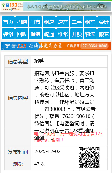 招聘网店打字客服,要求打字熟练,有责任心,善于沟通,可以接受晚班,两班倒,晚班可以住宿,地址方大科技园,工作环境好氛围好,工资3000以上,有经验者优先,联系17633190610(微信同步 【电话咨询时,请一定说明在宁晋123看到的,谢谢!】 |