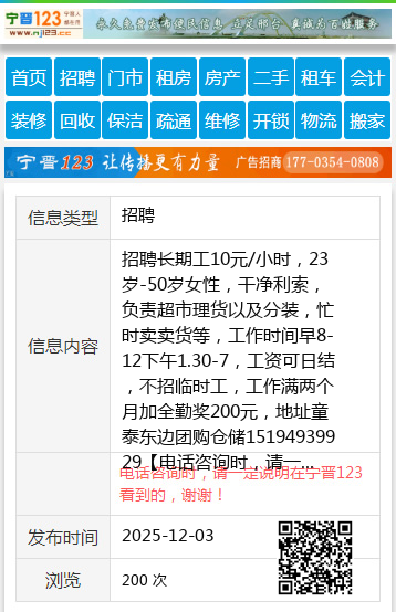 招聘长期工10元/小时,23岁-50岁女性,干净利索,负责超市理货以及分装,忙时卖卖货等,工作时间早8-12下午1.30-7,工资可日结,不招临时工,工作满两个月加全勤奖200元,地址童泰东边团购仓储15194939929 【电话咨询时,请一定说明在宁晋123看到的,谢谢!】 |