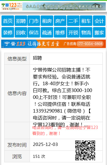 宁晋传媒公司招聘主播!不要求有经验。会说普通话就行。18-40岁女士!新手小白可教。综合工资3000-10000上不封顶!可兼职可全职!公司提供住宿!联系电话13393290981(微信号) 【电话咨询时,请一定说明在宁晋123看到的,谢谢!】 |