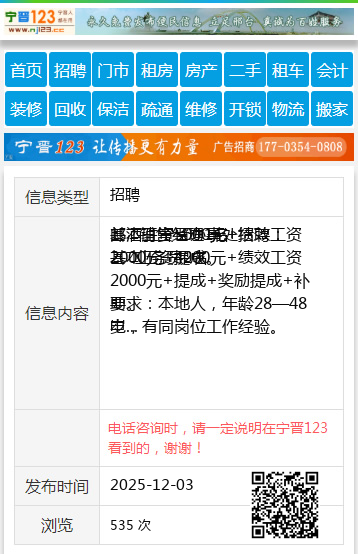 要求:本地人,年龄28—48岁,有同岗位工作经验。