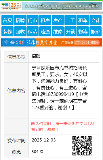 宁晋家乐园布克书城招聘长期员工,要求。女,40岁以下,沟通能力良好,有耐心,有责任心,有上进心,咨询电话18730999419