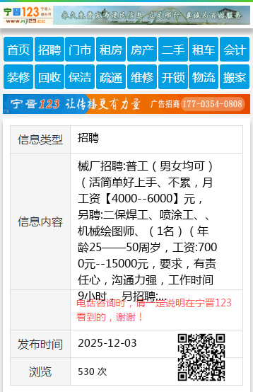 械厂招聘:普工(男女均可)(活简单好上手、不累,月工资【4000--6000】元, 另聘:二保焊工、喷涂工、、机械绘图师、(1名)(年龄25——50周岁,工资:7000元--15000元,要求,有责任心,沟通力强,工作时间9小时, 另招聘:车间主任助手,要求=必须熟悉机械原理。 工资7000-11000元,有能力的,上不封顶, 工作地址:唐邱乡 联系电话:15612989507 【电话咨询时,请一定说明在宁晋123看到的,谢谢!】 |