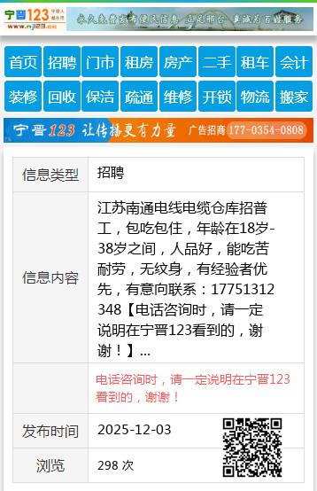 江苏南通电线电缆仓库招普工,包吃包住,年龄在18岁-38岁之间,人品好,能吃苦耐劳,无纹身,有经验者优先,有意向联系:17751312348 【电话咨询时,请一定说明在宁晋123看到的,谢谢!】 |