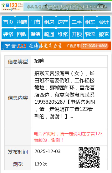 | 防骗提醒: | 宁晋123(www.nj123.cc)提醒您:手工活、网络兼职、刷单,都是骗子!凡以各种名义收取费用的都是骗子!找工作是往兜里挣钱,让你往外掏钱的都是骗子!异地招聘请提高警惕,谨防诈骗! |