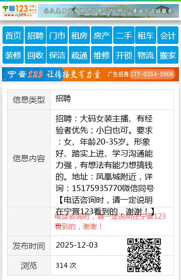 招聘:大码女装主播、有经验者优先;小白也可。要求:女、年龄20-35岁。形象好、踏实上进、学习沟通能力强,有想法有能力想搞钱的。地址:凤凰城附近,详询:15175935770微信同号 【电话咨询时,请一定说明在宁晋123看到的,谢谢!】 |
