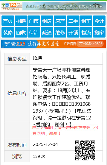宁晋天一广场叩朴创意料理招聘啦、只招长期工、现诚聘、后厨配菜2名、工资月结、要求:18周岁以上、有连锁餐饮工作经验优先、联系电话:13910682937(微信同号) 【电话咨询时,请一定说明在宁晋123看到的,谢谢!】 |