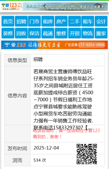 若晟商贸主营康师傅饮品旺仔系列招车销业务员年龄25-35岁之间县城附近居住工资底薪加提成综合薪资(4500~7000)节假日福利工作地点宁晋县城要求能熟练驾驶小型厢货车吃苦耐劳沟通能力强有一年销售工作经验者.联系电话15833297307 【电话咨询时,请一定说明在宁晋123看到的,谢谢!】 |