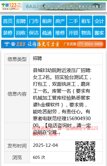 县城妇幼院附近液压厂招聘:女工2名。招实验台测试工,打包工,双面铣床工,磨床工一名。库管一名(要求有机械加工管库经验熟悉管家婆h金蝶软件),要求男,能吃苦耐劳,有责任心。有意者电联范经理15690493000。 【电话咨询时,请一定说明在宁晋123看到的,谢谢!】 |