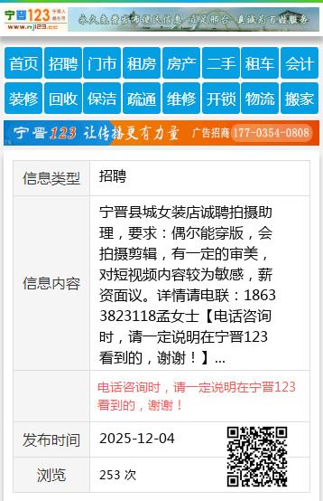 宁晋县城女装店诚聘拍摄助理,要求:偶尔能穿版,会拍摄剪辑,有一定的审美,对短视频内容较为敏感,薪资面议。详情请电联:18633823118孟女士 【电话咨询时,请一定说明在宁晋123看到的,谢谢!】 |