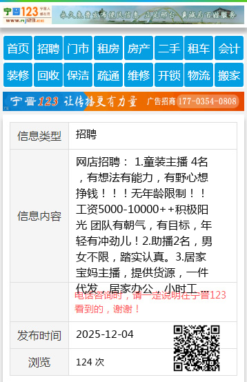 网店招聘: 1.童装主播 4名,有想法有能力,有野心想挣钱!!!无年龄限制!!工资5000-10000++积极阳光 团队有朝气,有目标,年轻有冲劲儿!2.助播2名,男女不限,踏实认真。3.居家宝妈主播,提供货源,一件代发,居家办公,小时工 有工作经验者优先录用!!!男女不限。地址:东亚 菜市场 大医院附近 县城 ,联系电话:15533197597 【电话咨询时,请一定说明在宁晋123看到的,谢谢!】 |