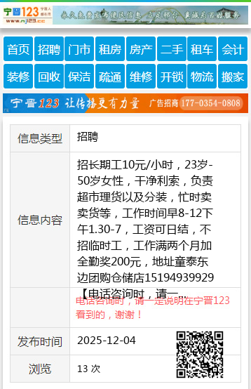 招长期工10元/小时,23岁-50岁女性,干净利索,负责超市理货以及分装,忙时卖卖货等,工作时间早8-12下午1.30-7,工资可日结,不招临时工,工作满两个月加全勤奖200元,地址童泰东边团购仓储店15194939929 【电话咨询时,请一定说明在宁晋123看到的,谢谢!】 |