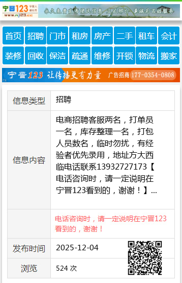 电商招聘客服两名,打单员一名,库存整理一名,打包人员数名,临时勿扰,有经验者优先录用,地址方大西临电话联系13932727173 【电话咨询时,请一定说明在宁晋123看到的,谢谢!】 |