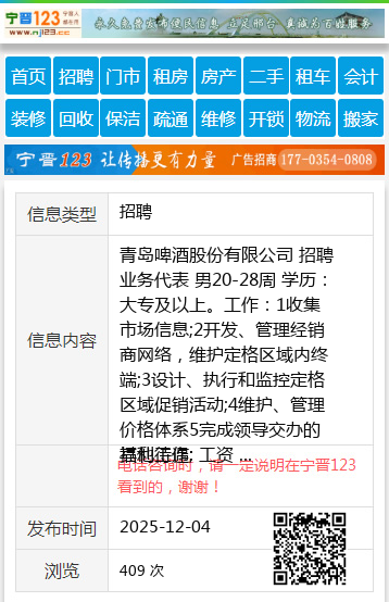青岛啤酒股份有限公司 招聘业务代表 男20-28周 学历:大专及以上。工作:1收集市场信息;2开发、管理经销商网络,维护定格区域内终端;3设计、执行和监控定格区域促销活动;4维护、管理价格体系5完成领导交办的其他工作;