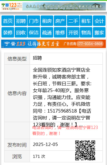 全国连锁如家酒店宁晋店全新升级,诚聘客房部主管,长白班,节假日三薪。要求:女年龄25-40周岁。服务意识强,沟通能力佳。应变能力足,有责任心。手机微信同号:15175968518 【电话咨询时,请一定说明在宁晋123看到的,谢谢!】 |