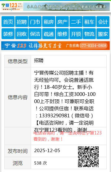 宁晋传媒公司招聘主播!有无经验均可。会说普通话就行!18-40岁女士。新手小白可带!综合工资3000-10000上不封顶!可兼职可全职!公司提供住宿!联系电话:13393290981(微信号) 【电话咨询时,请一定说明在宁晋123看到的,谢谢!】 |