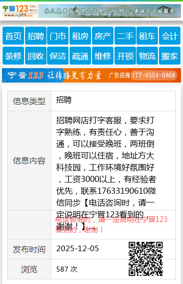 招聘网店打字客服,要求打字熟练,有责任心,善于沟通,可以接受晚班,两班倒,晚班可以住宿,地址方大科技园,工作环境好氛围好,工资3000以上,有经验者优先,联系17633190610微信同步 【电话咨询时,请一定说明在宁晋123看到的,谢谢!】 |