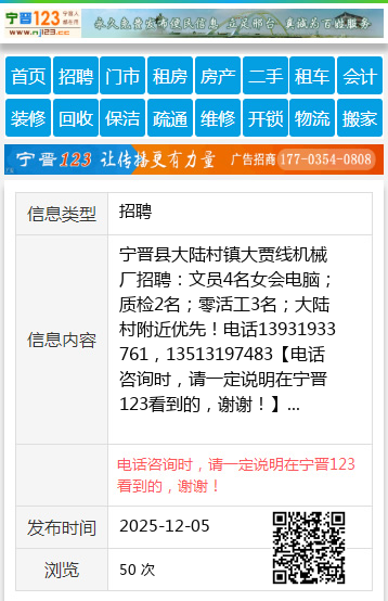 宁晋县大陆村镇大贾线机械厂招聘:文员4名女会电脑;质检2名;零活工3名;大陆村附近优先!电话13931933761,13513197483 【电话咨询时,请一定说明在宁晋123看到的,谢谢!】 |