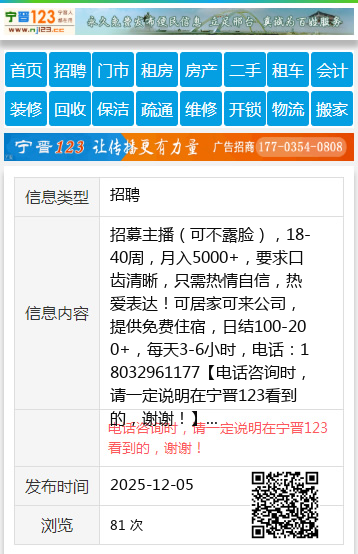招募主播(可不露脸),18-40周,月入5000+,要求口齿清晰,只需热情自信,热爱表达!可居家可来公司,提供免费住宿,日结100-200+,每天3-6小时,电话:18032961177 【电话咨询时,请一定说明在宁晋123看到的,谢谢!】 |