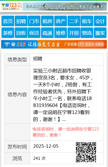 实验三小附近超市招聘收银理货员3名,要求女,45岁,一天8个小时,2班倒,有工作经验者优先,另外招聘下午小时工一名,联系电话18831939604 【电话咨询时,请一定说明在宁晋123看到的,谢谢!】 |