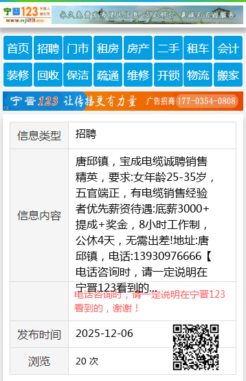 唐邱镇,宝成电缆诚聘销售精英,要求:女年龄25-35岁,五官端正,有电缆销售经验者优先薪资待遇:底薪3000+提成+奖金,8小时工作制,公休4天,无需出差!地址:唐邱镇,电话:13930976666 【电话咨询时,请一定说明在宁晋123看到的,谢谢!】 |