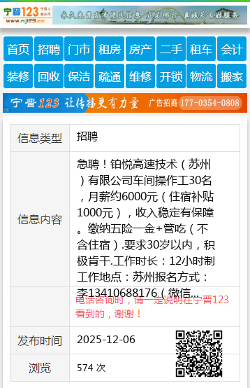 急聘!铂悦高速技术(苏州)有限公司车间操作工30名,月薪约6000元(住宿补贴1000元),收入稳定有保障。缴纳五险一金+管吃(不含住宿).要求30岁以内,积极肯干.工作时长:12小时制工作地点:苏州报名方式:李13410688176(微信同号)