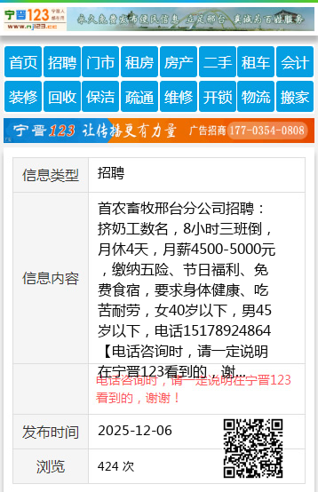 首农畜牧邢台分公司招聘:挤奶工数名,8小时三班倒,月休4天,月薪4500-5000元,缴纳五险、节日福利、免费食宿,要求身体健康、吃苦耐劳,女40岁以下,男45岁以下,电话15178924864 【电话咨询时,请一定说明在宁晋123看到的,谢谢!】 |