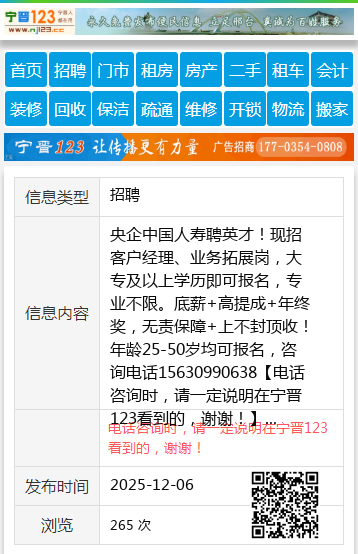 央企中国人寿聘英才!现招客户经理、业务拓展岗,大专及以上学历即可报名,专业不限。底薪+高提成+年终奖,无责保障+上不封顶收!年龄25-50岁均可报名,咨询电话15630990638 【电话咨询时,请一定说明在宁晋123看到的,谢谢!】 |